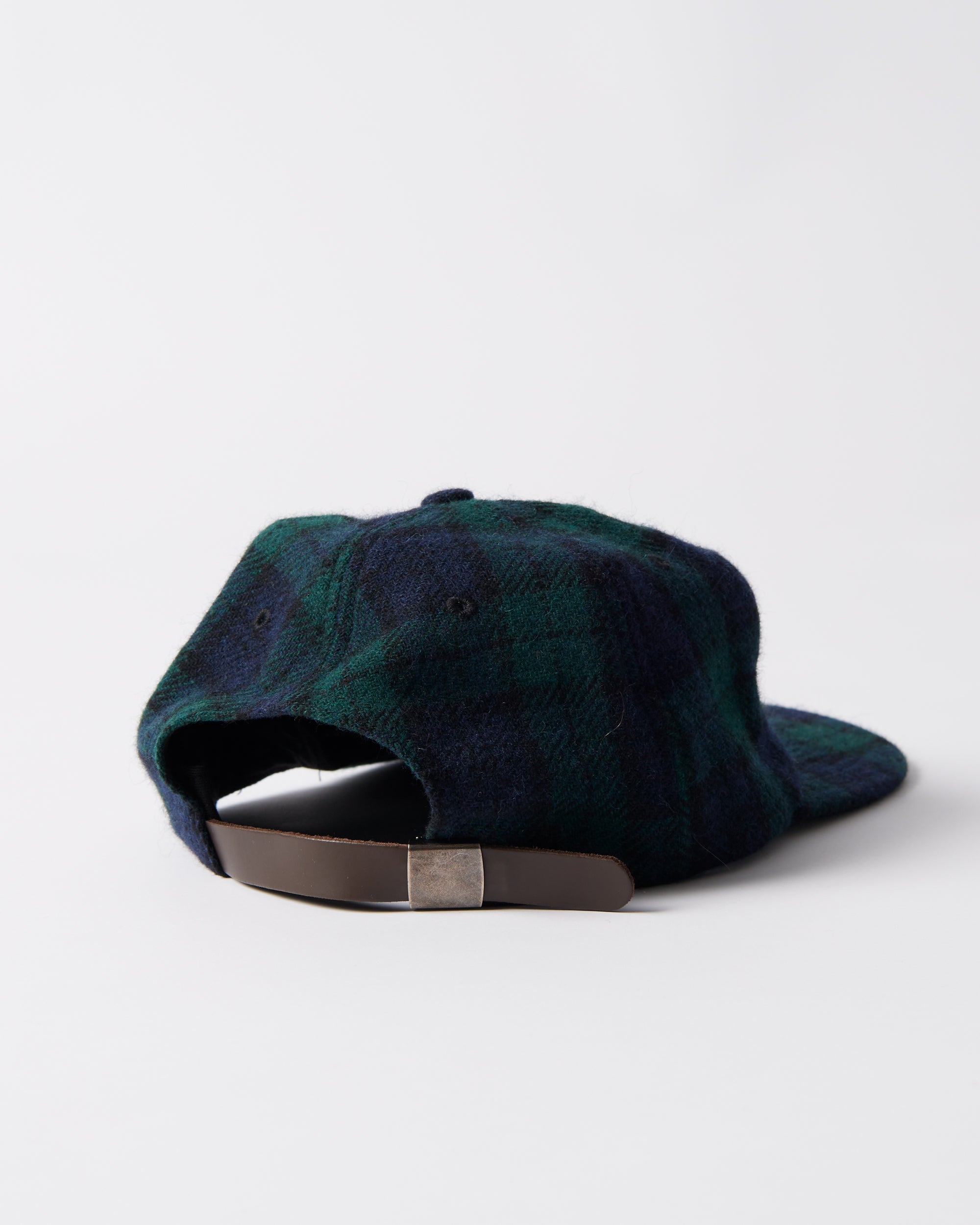 Wool mix hat with two embroideries and a leather strap closure.