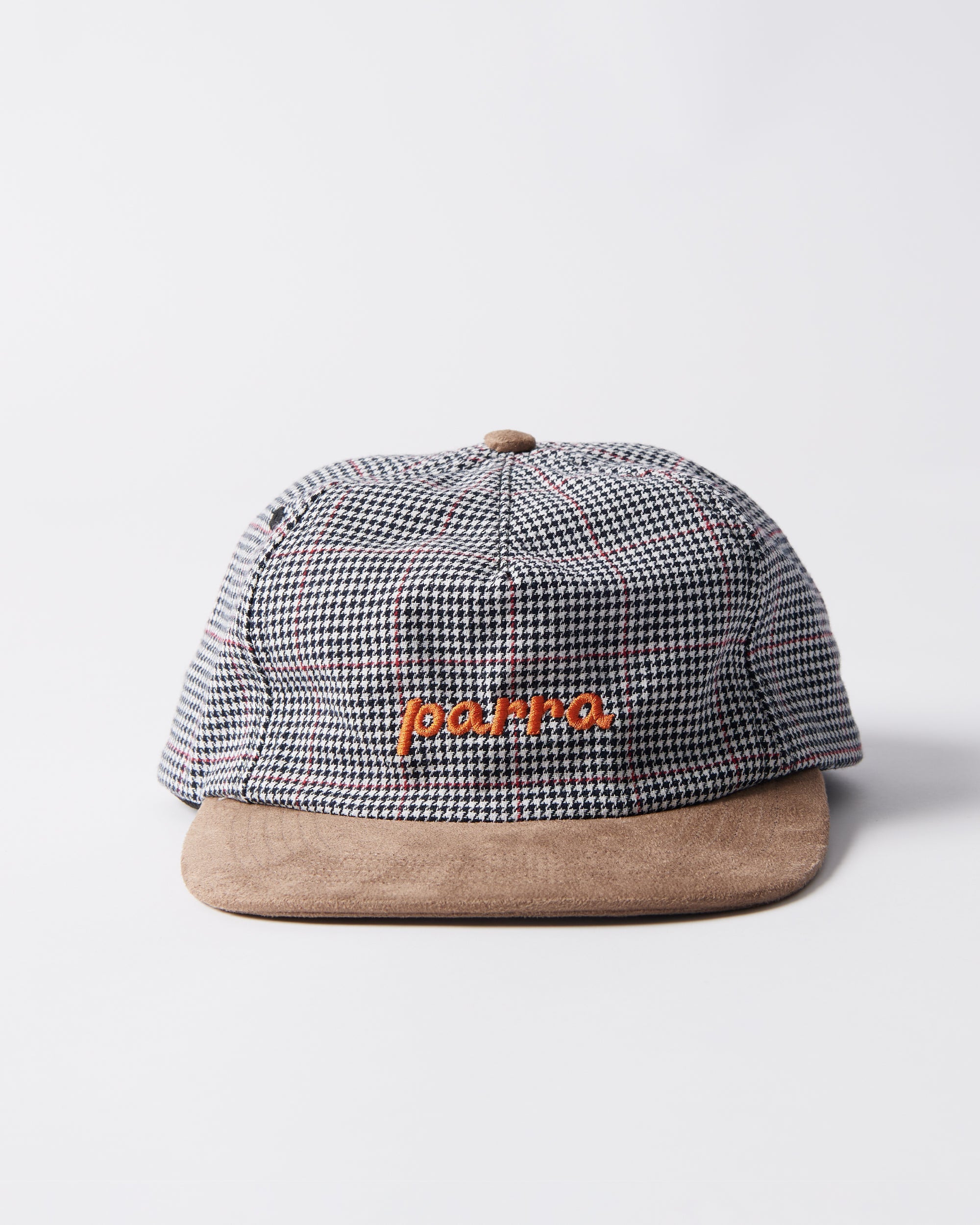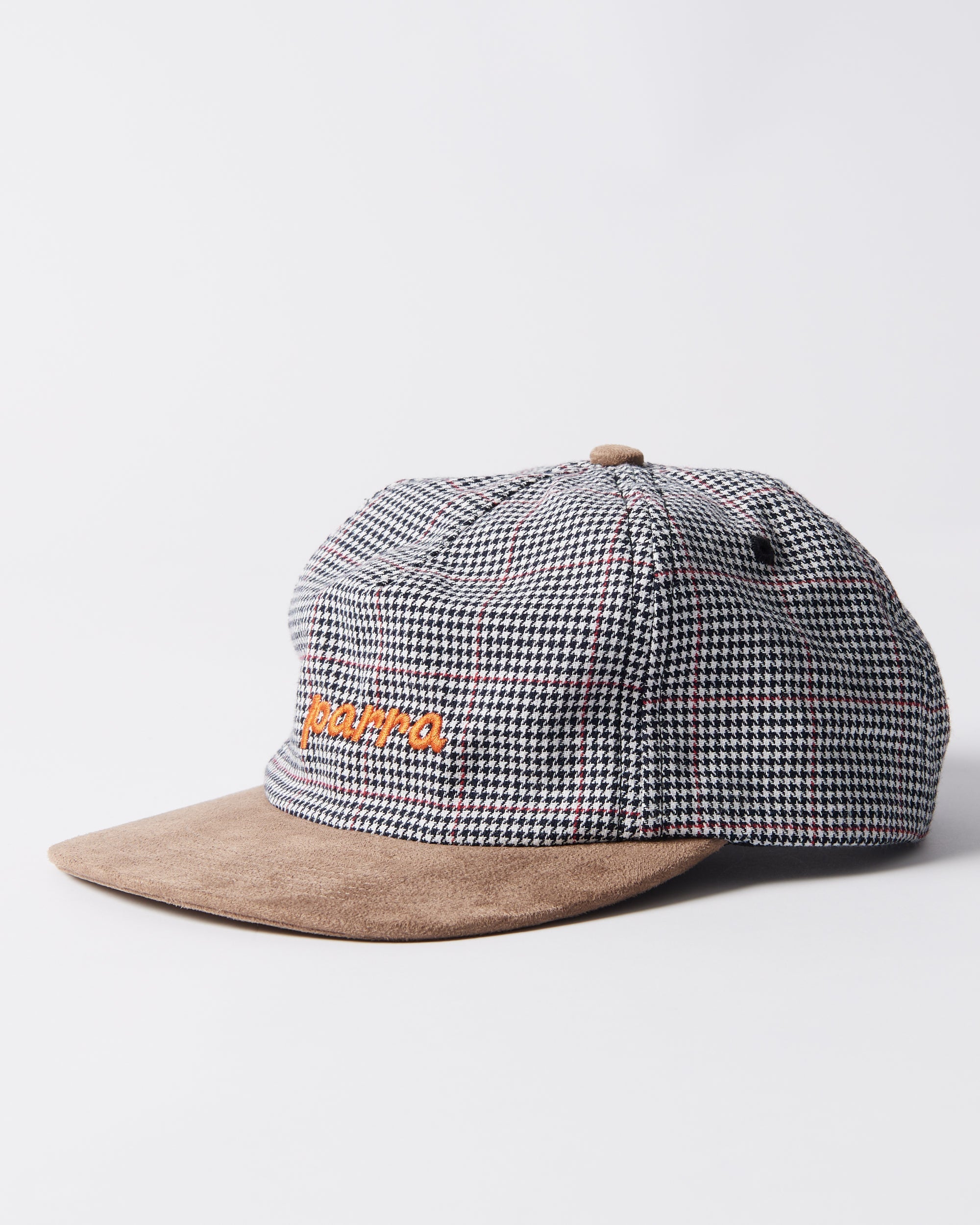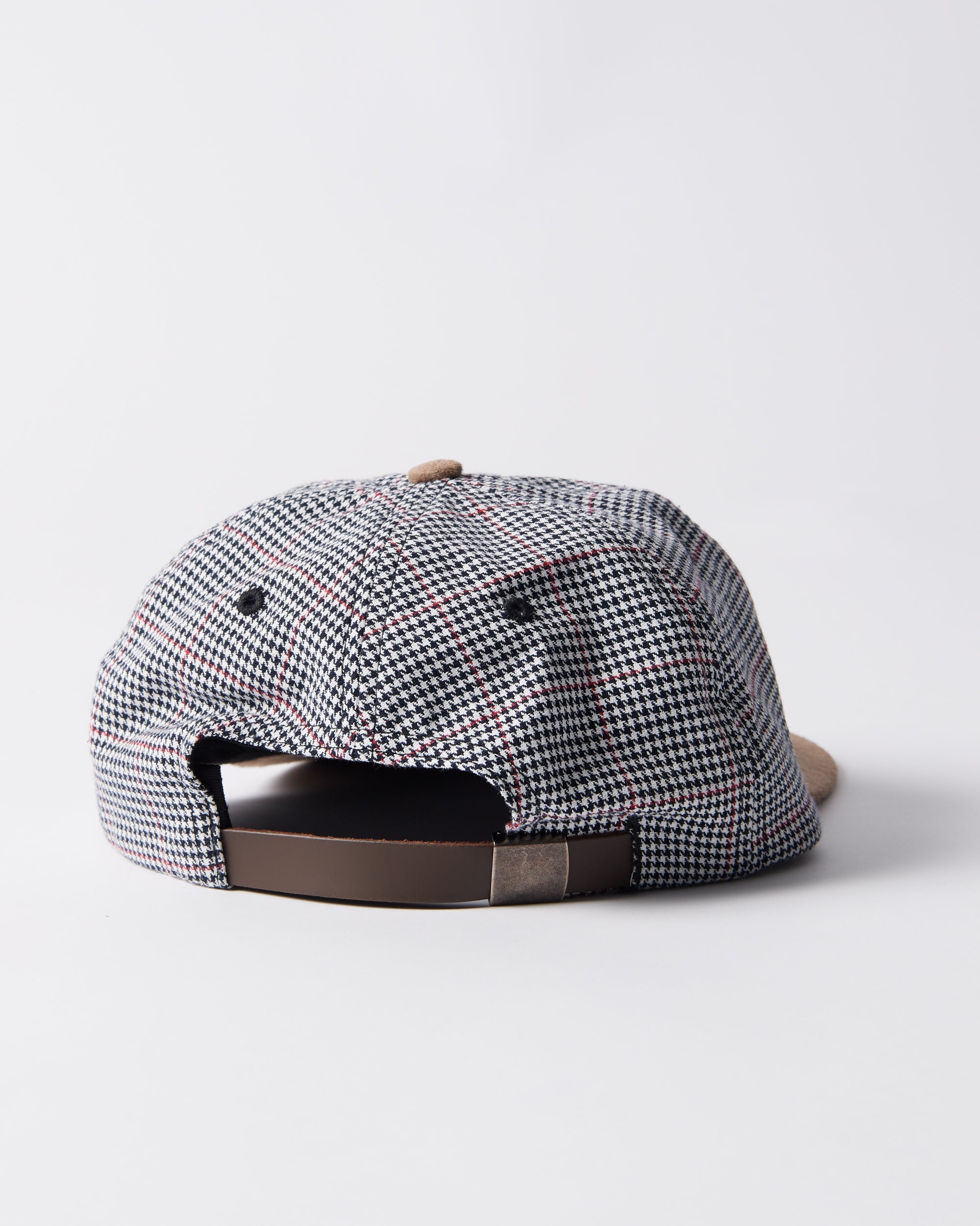 Hat made of a cotton twill plaid fabric with the Lowercase logo embroidery on the front. And a suede visor and top button.