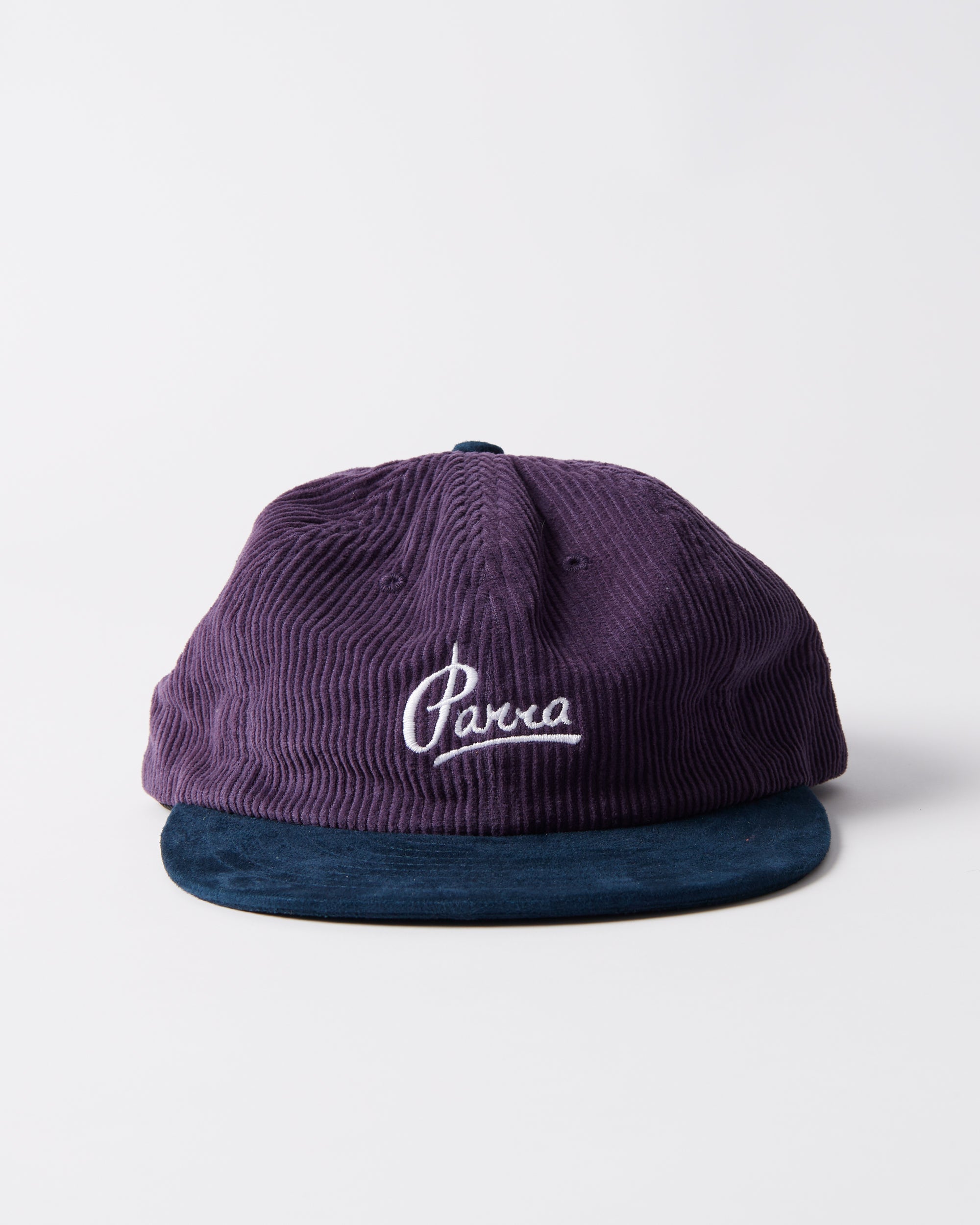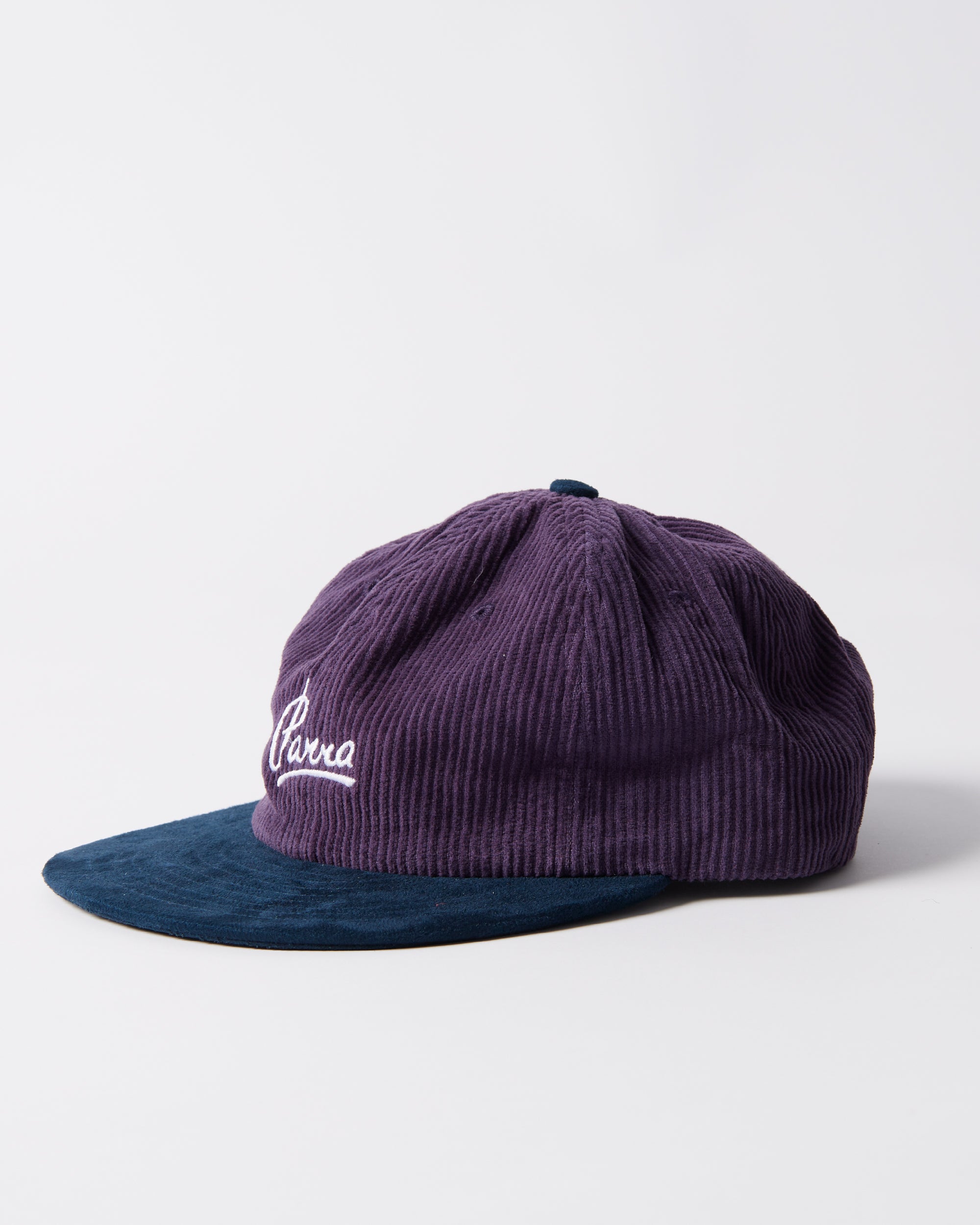 Hat made of a corduroy cotton fabric with the Painters script logo embroidery on the front. The visor an top button is suede.