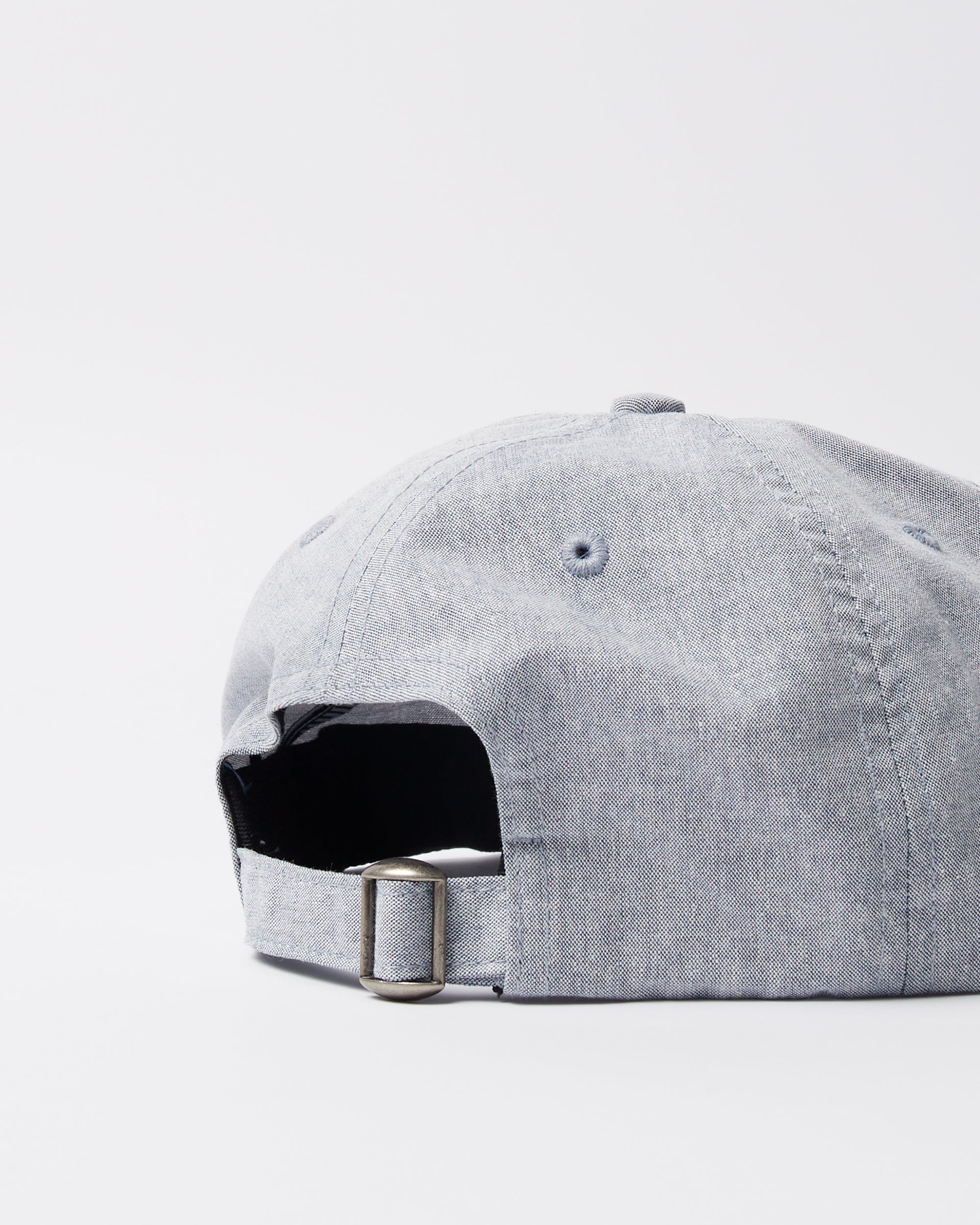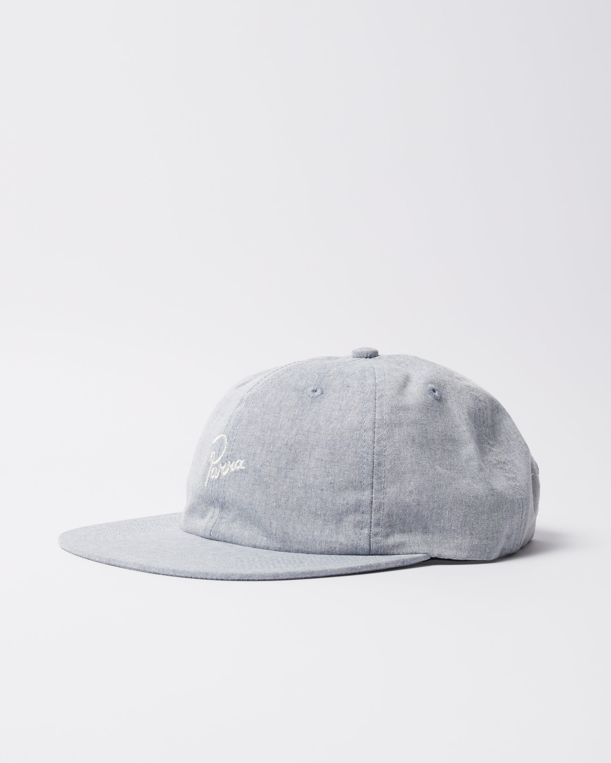 Unconstructed cotton chambray fabric hat with signature logo embroidery.