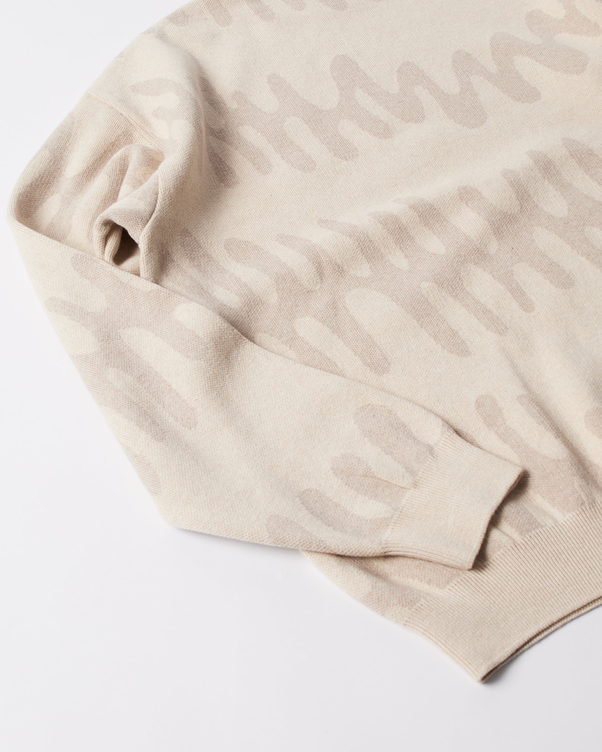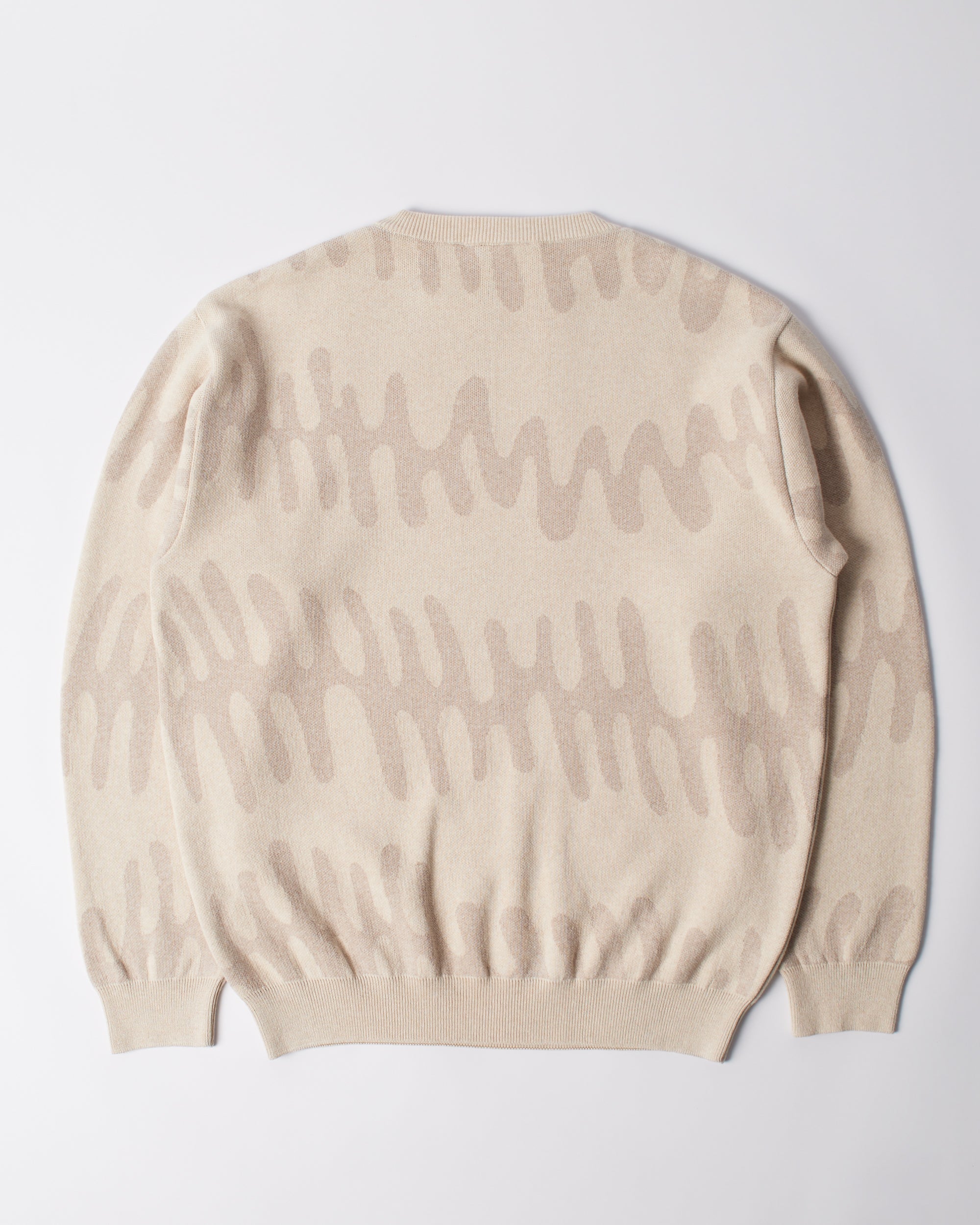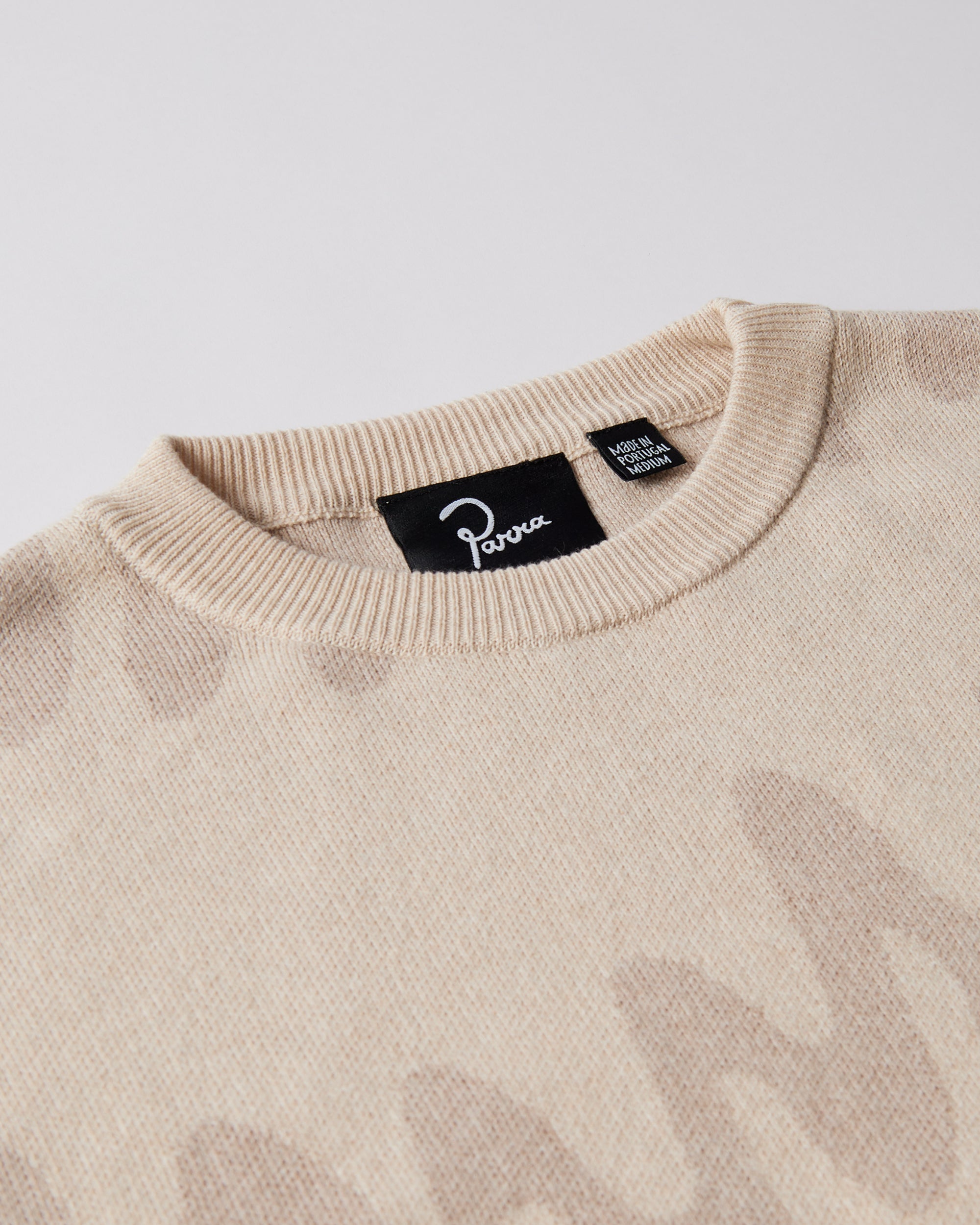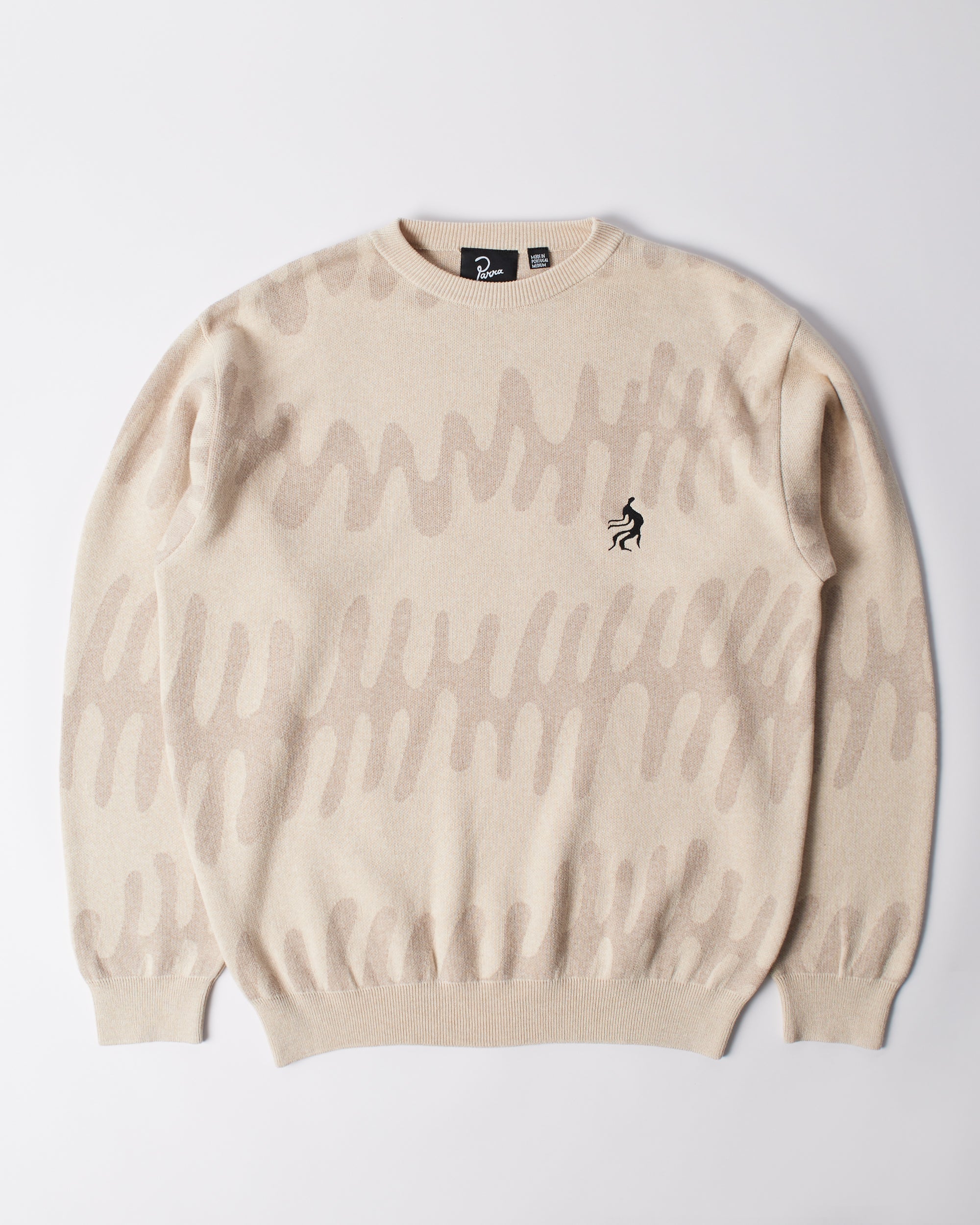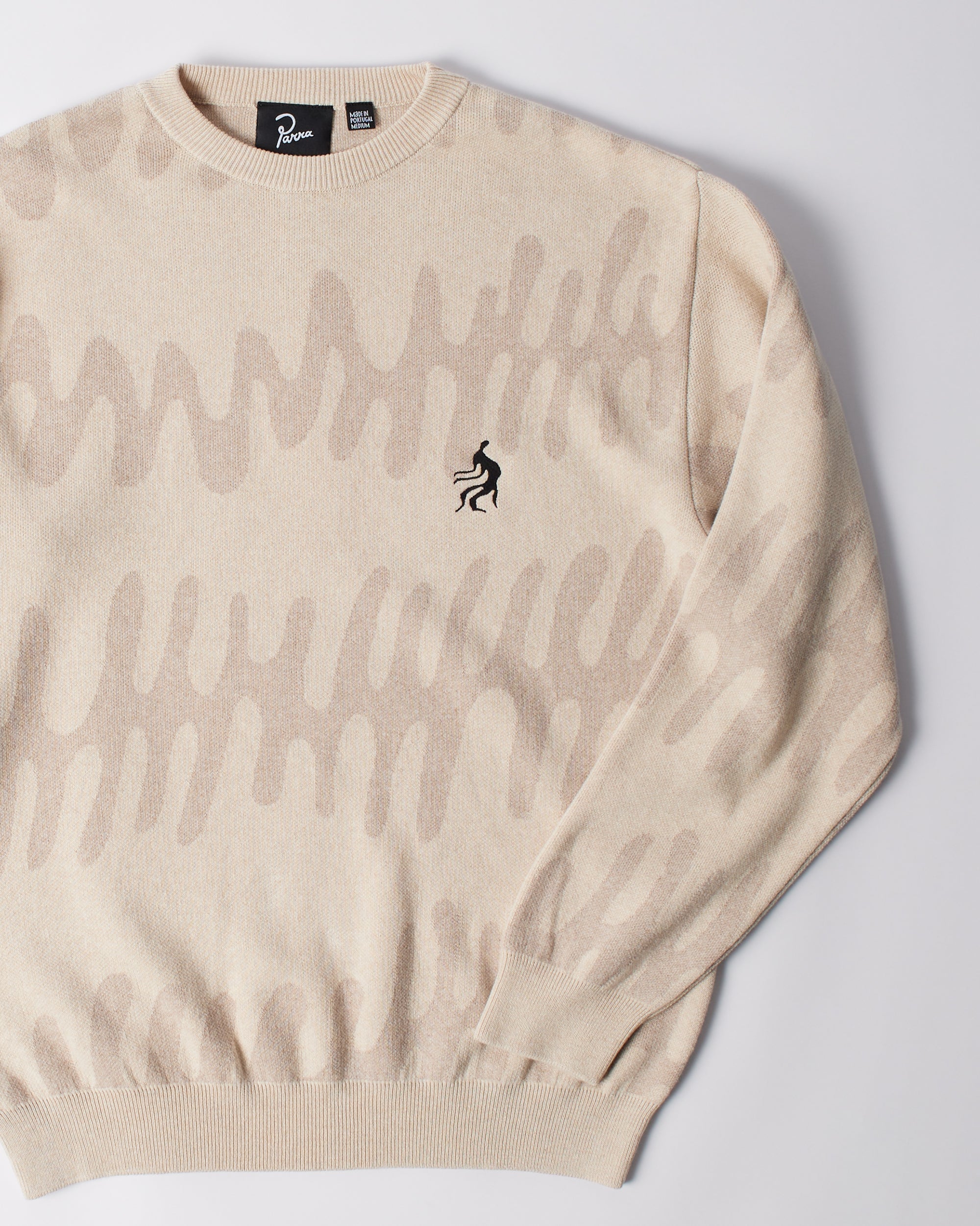 Pullover that is jacquard knitted and made in Portugal. Parra pattern all over. And a small Static stalker artwork as an embroidery on the chest.