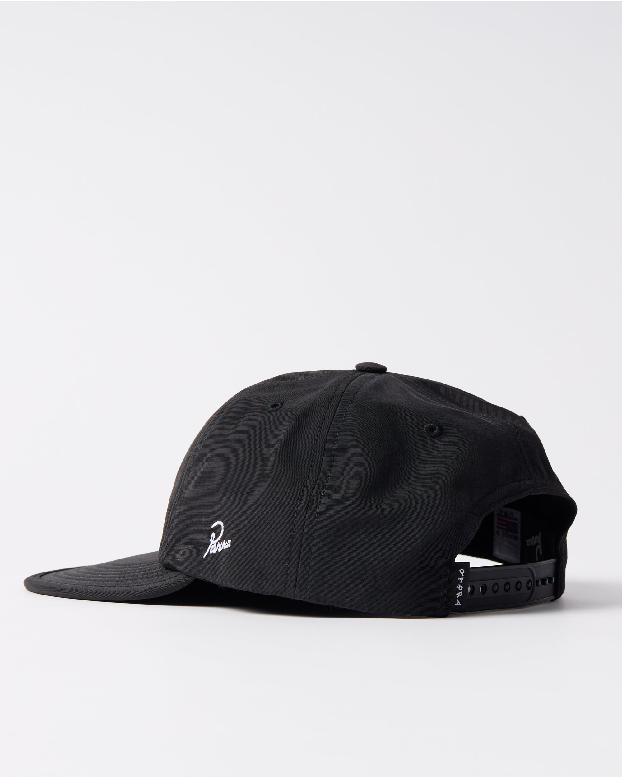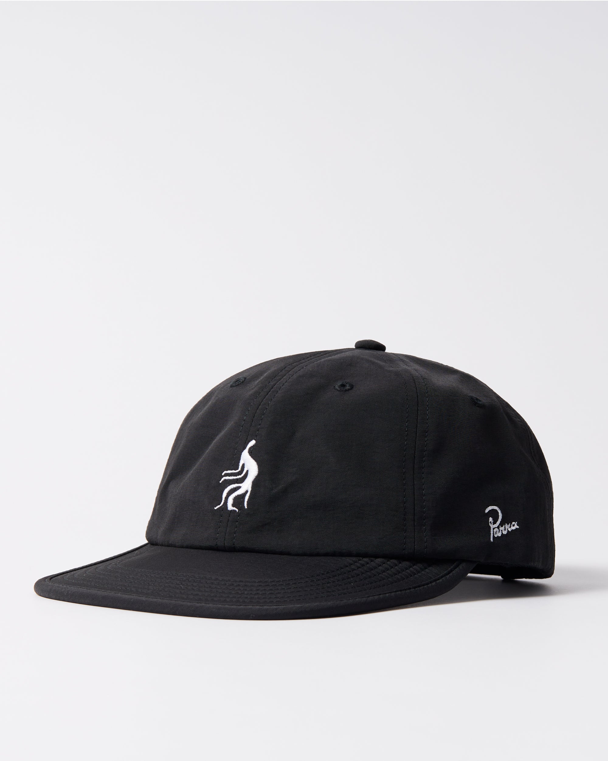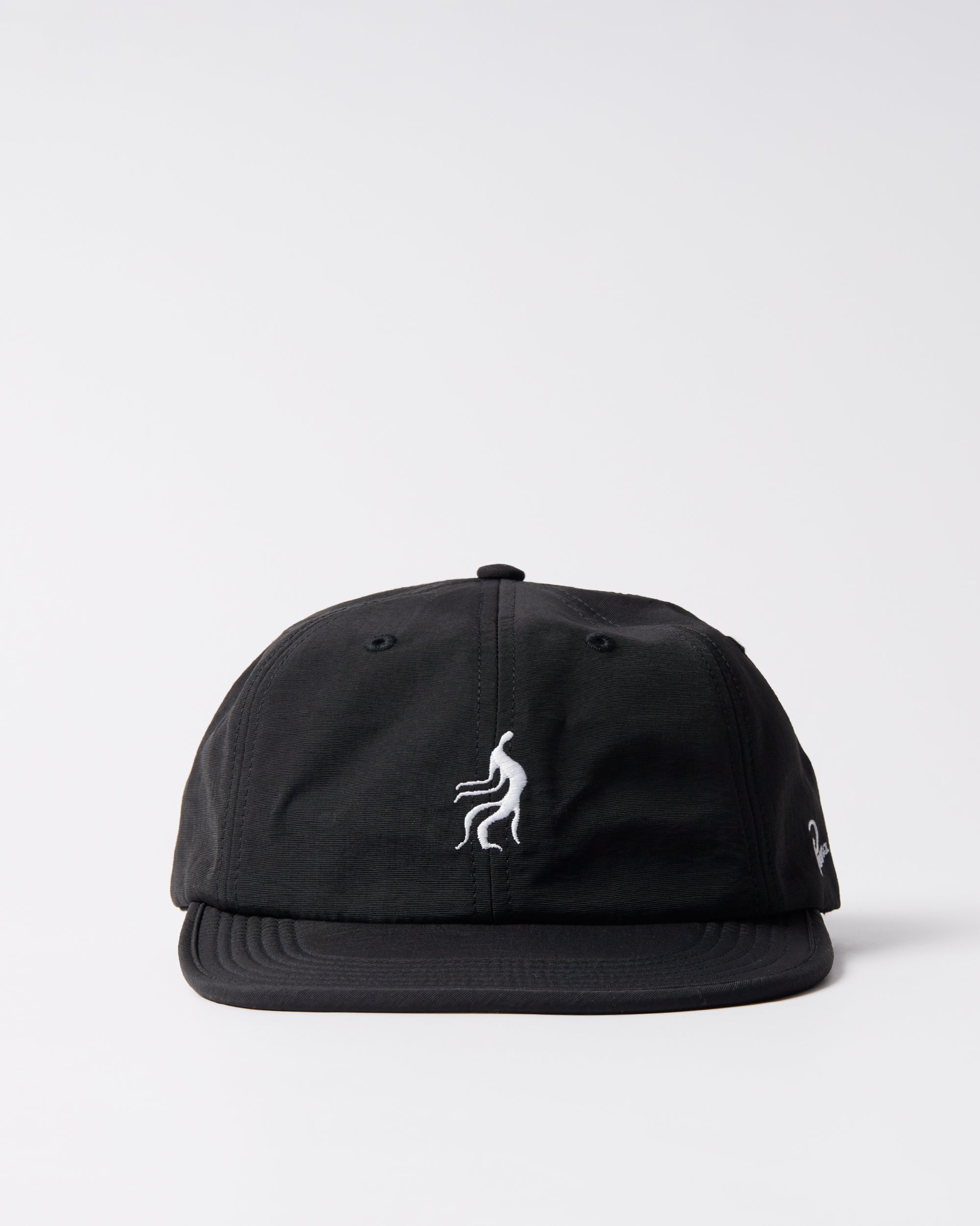 A 6 panel nylon hat, non reinforced and a flexfoam visor. Has an embroidery of the Blob on front. Snapback closure.