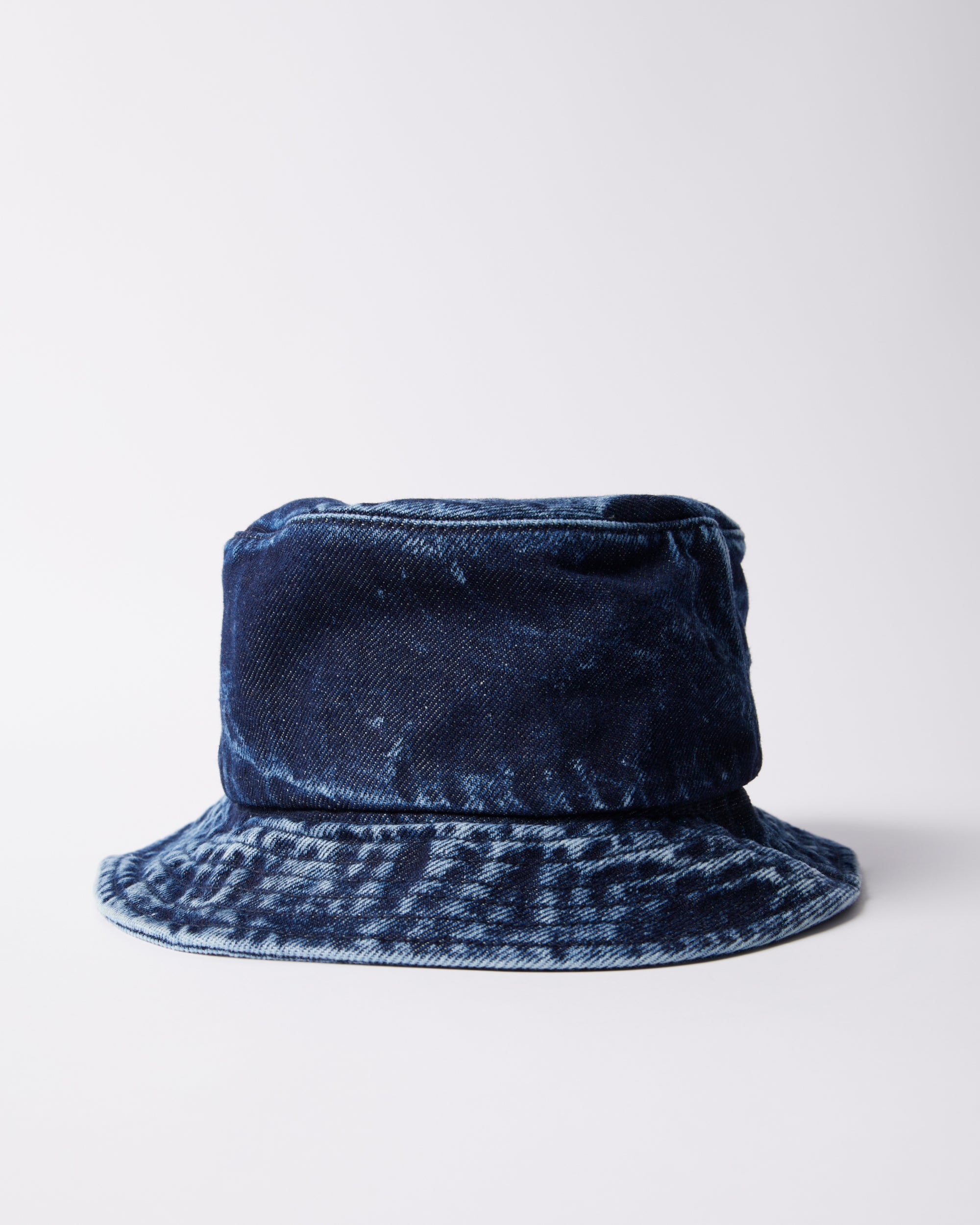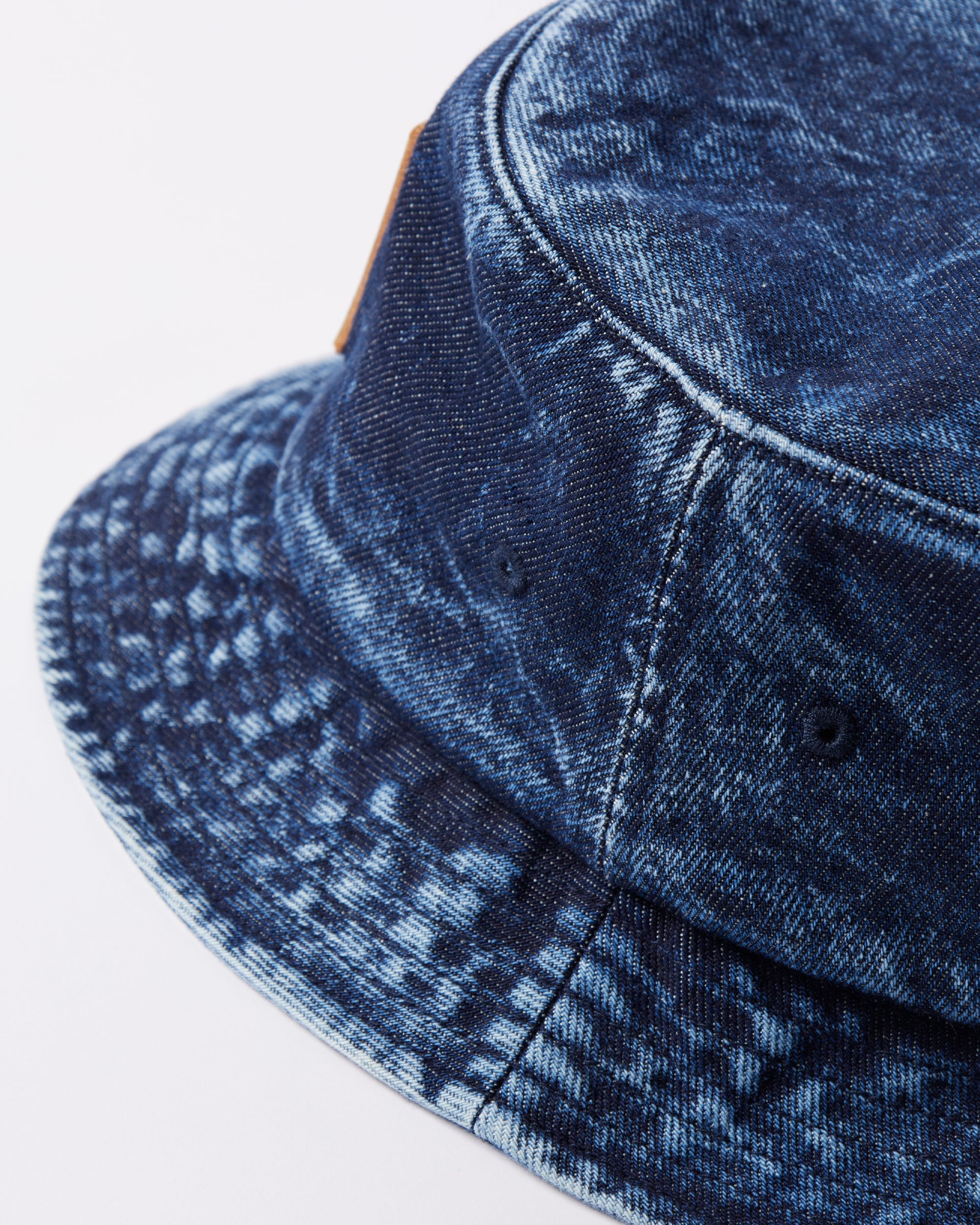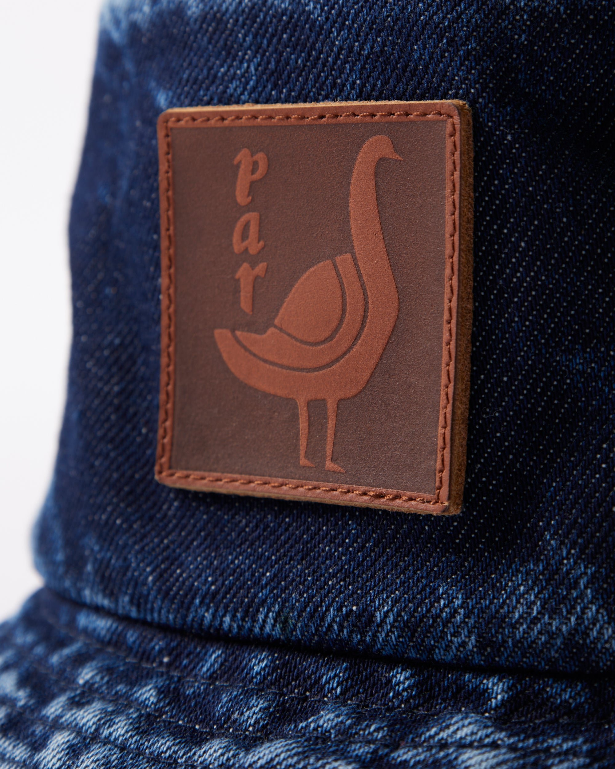 Washed denim bucket hat. Has a leather application with The great goose artwork at the front.