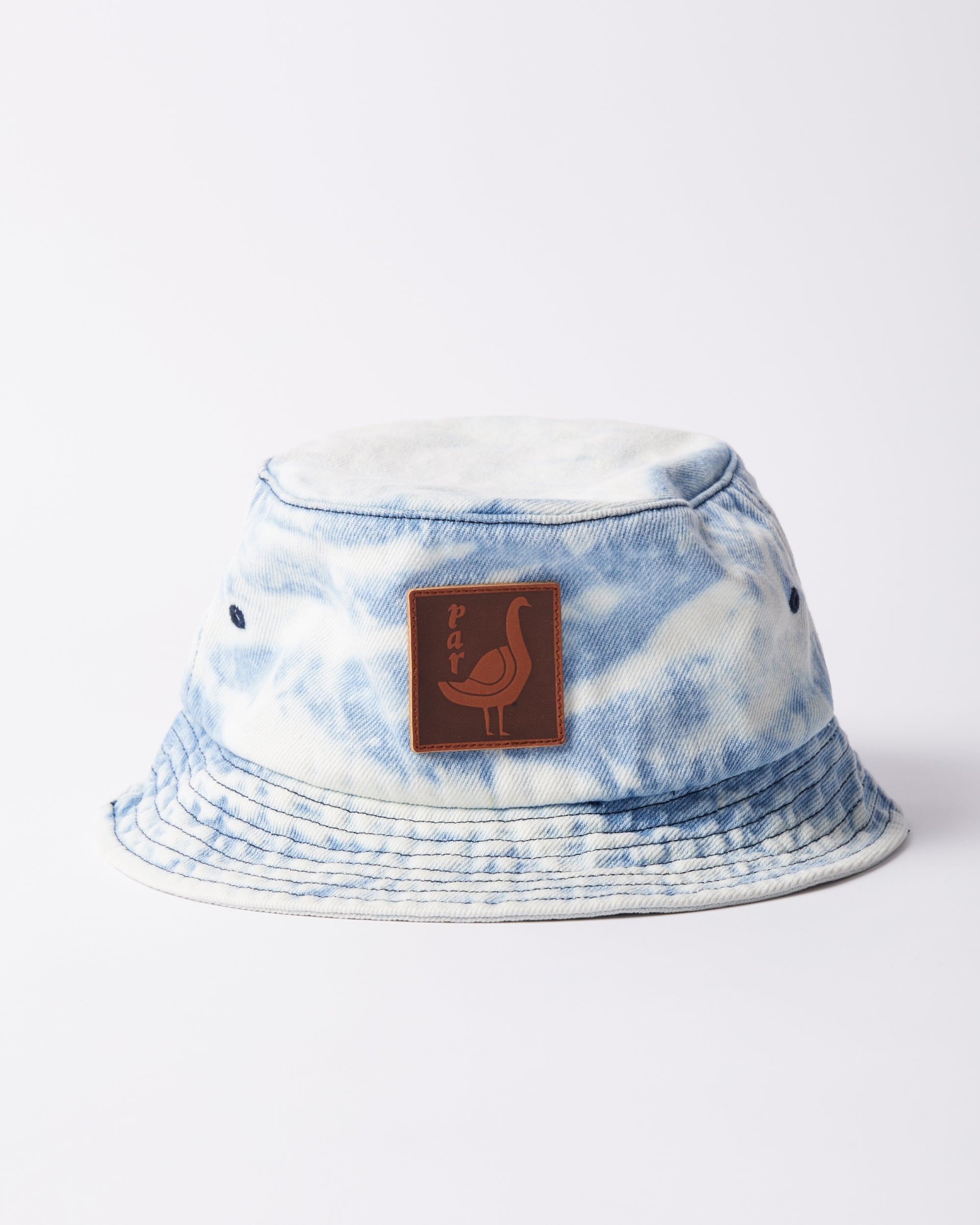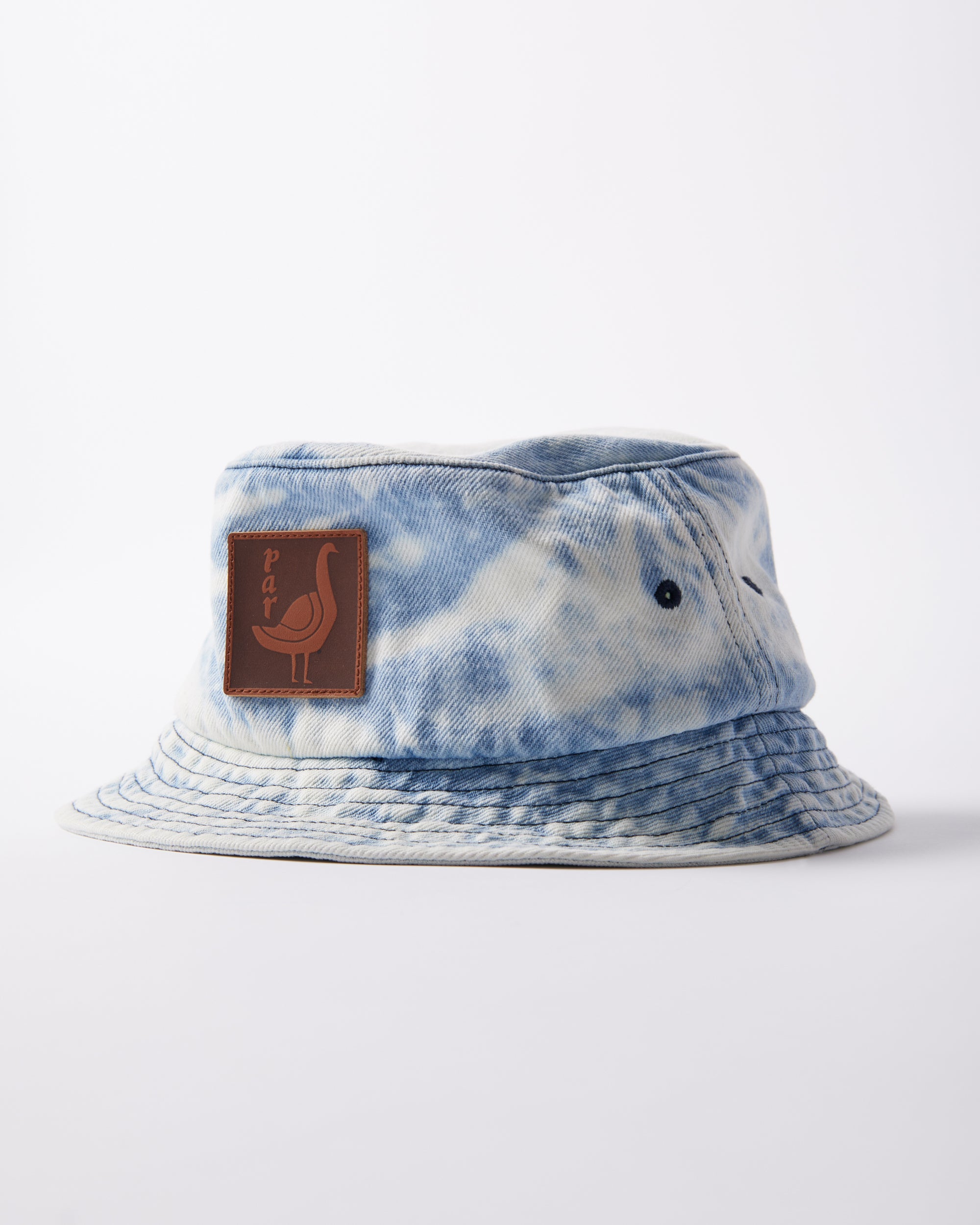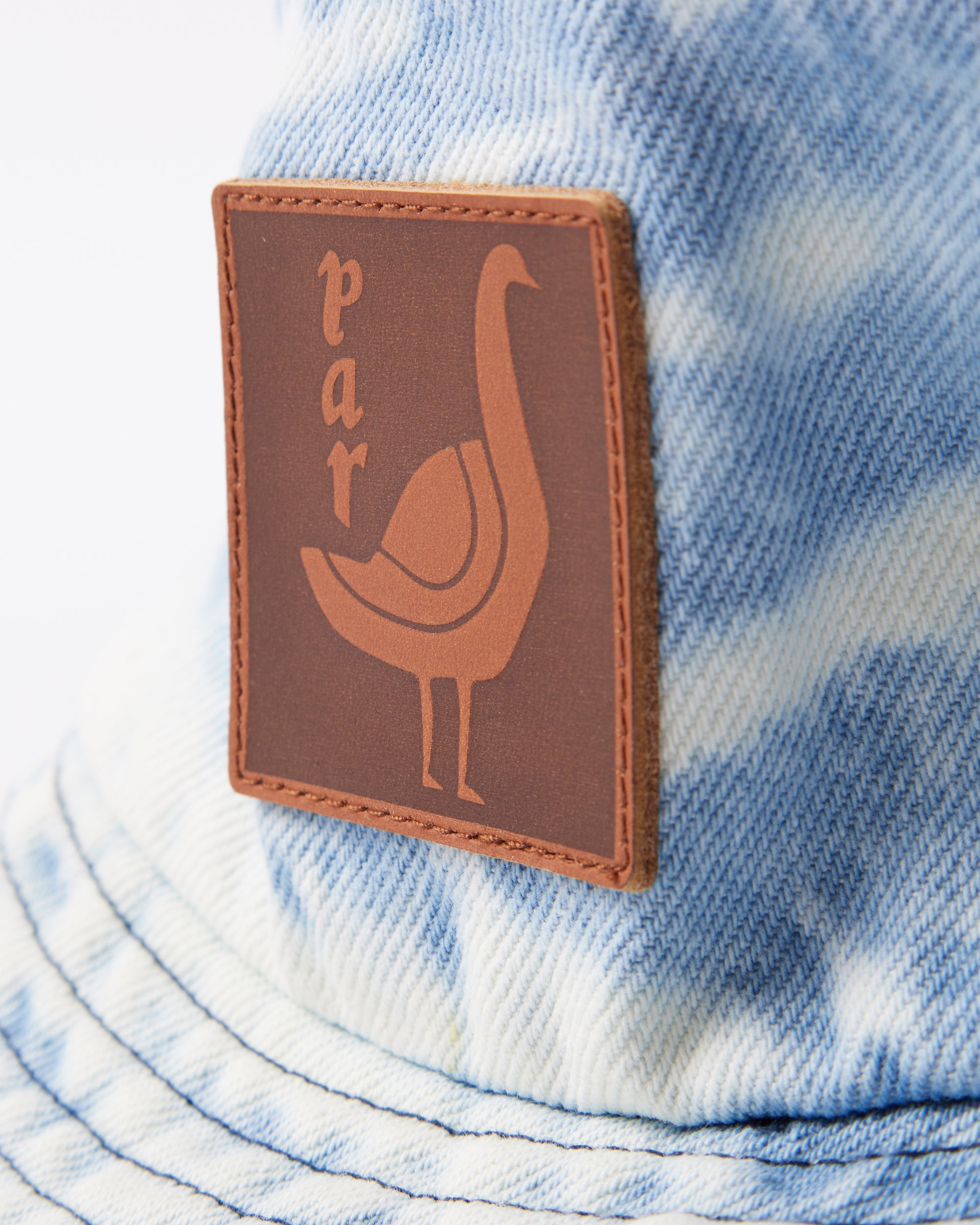 Washed denim bucket hat. Has a leather application with The great goose artwork at the front.