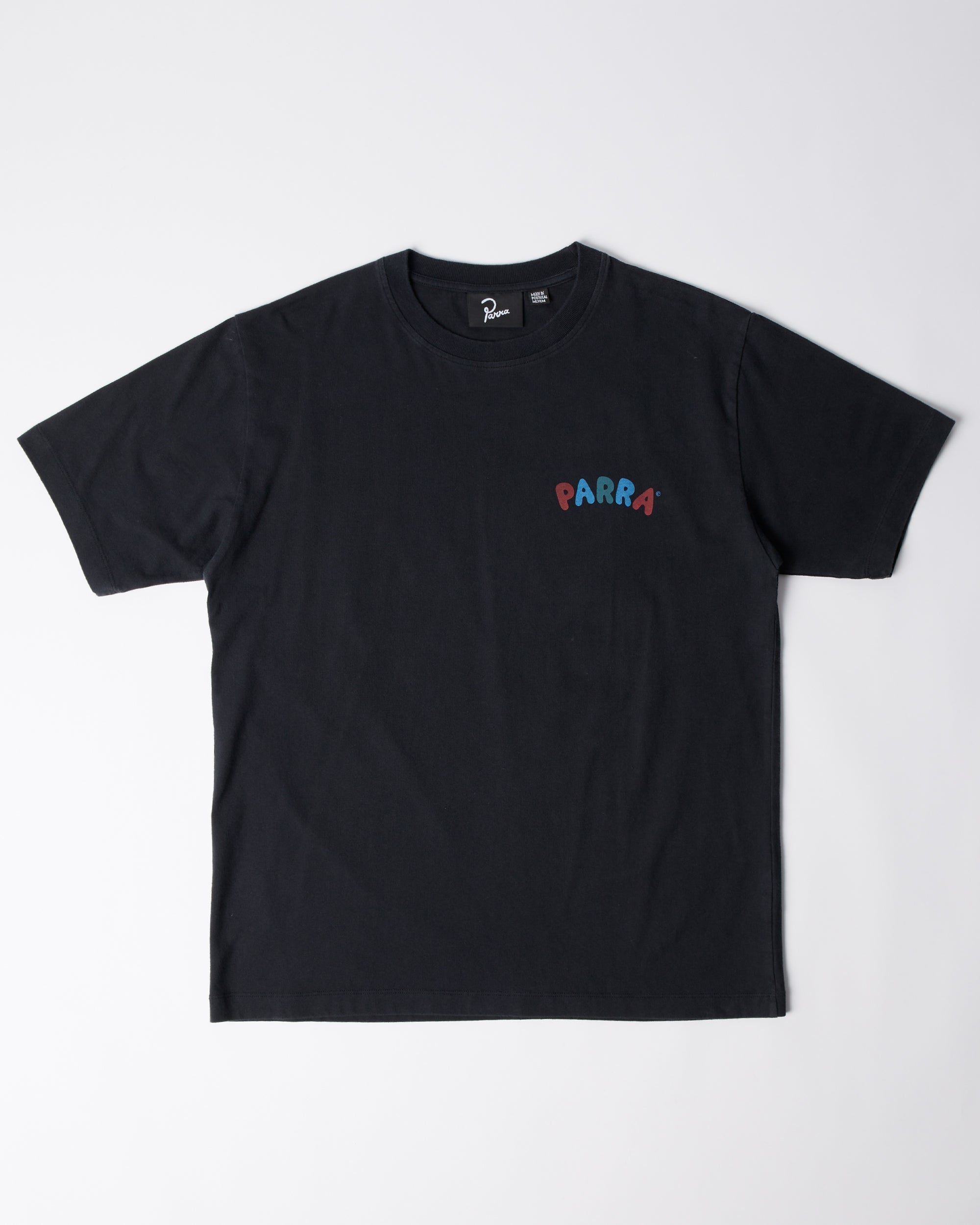 This damn chair artwork as a waterbased screenprint at the back and Parra printed on the chest. All Parra t-shirts are a boxy custom fit.