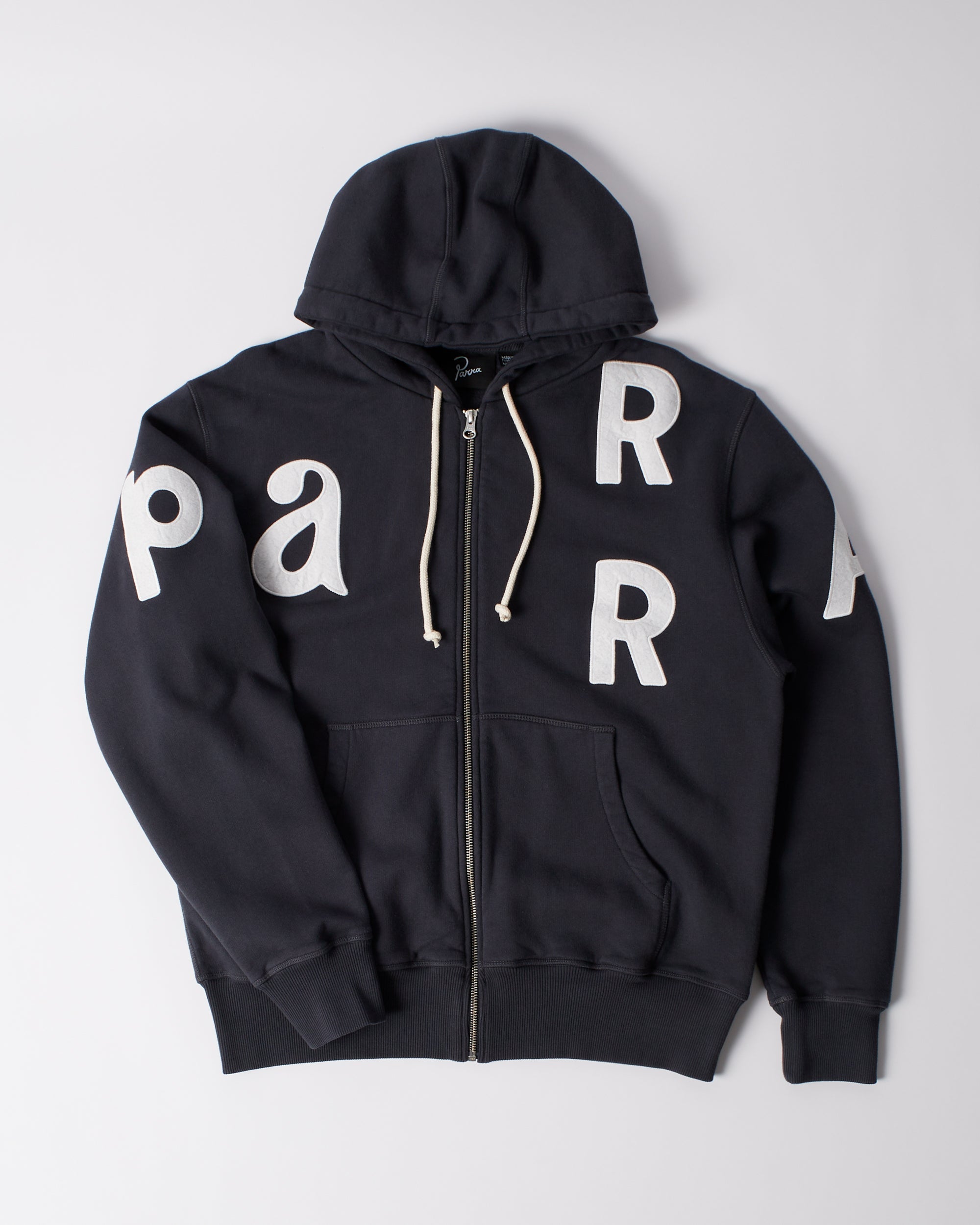 Zipper hoodie with appliqué lettering on the chest and sleeves. Made from extra heavy 100% cotton that's brushed on the inside for extra softness.